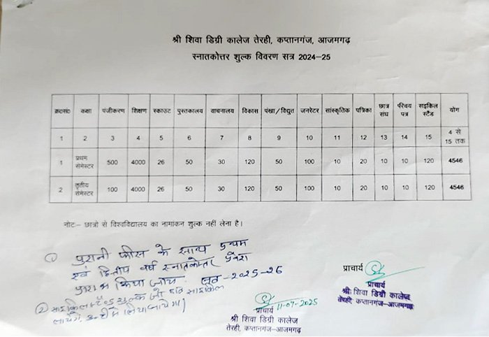 सभी नियमित पाठ्यक्रमों में उ0प्र0 शासन द्वारा निर्धारित शुल्क देय होगा। विभिन्न नियमित तथा स्ववित्तपोषित पाठ्यक्रमों के वार्षिक शुल्क एवं शैक्षिक अर्हता का विवरण तालिका में प्रस्तुत किया जा रहा है:-